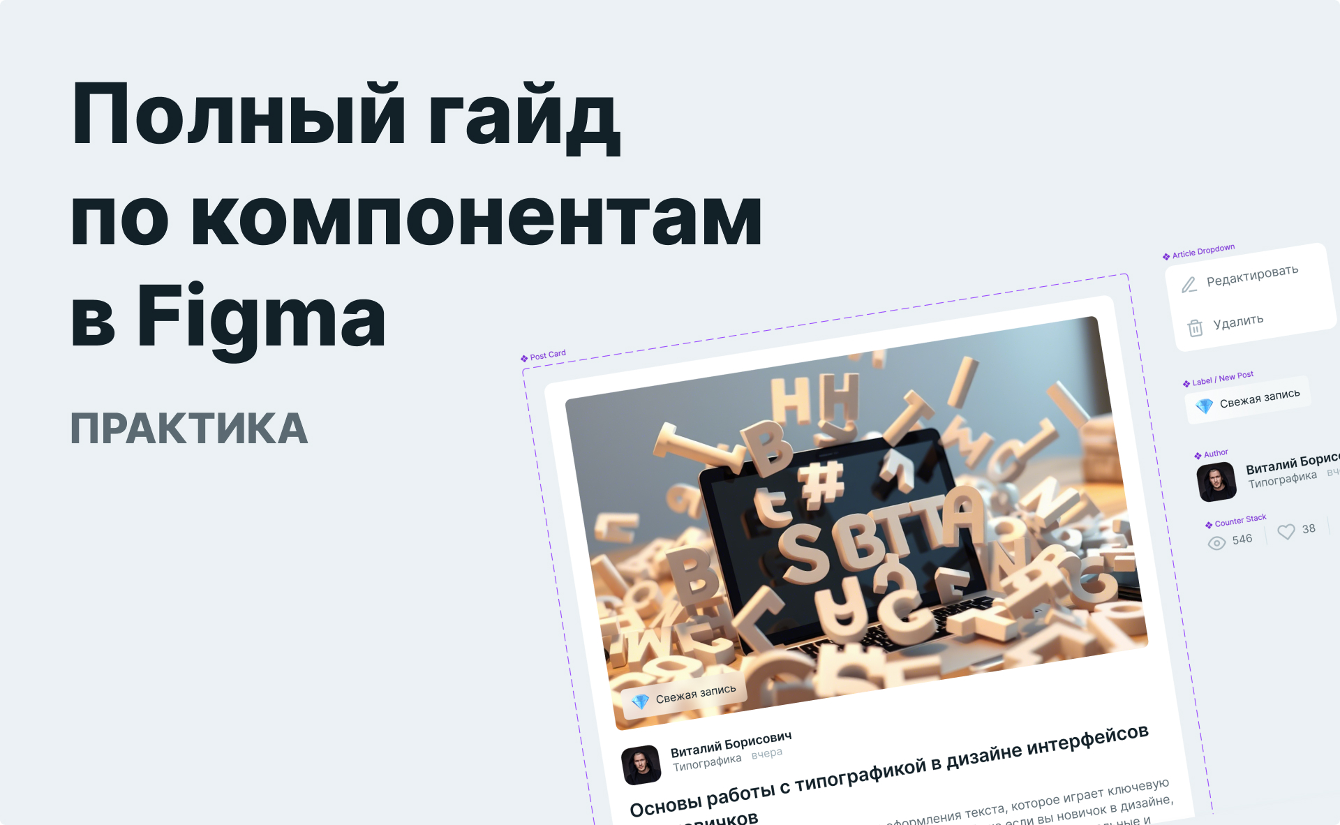 Компоненты в Фигма: подробный гайд, как сделать компонент, настроить свойства компонентов, использовать дочерний, родительский и варианты компонентов. Практический урок по созданию карточки статьи.